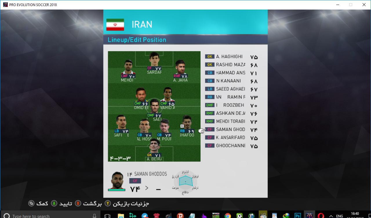 4- همانطور که اطلاع دارید با توجه به اینکه هنوز راه و روش مناسبی برای ساخت فیس در PES2018 منتشر شده است، پچ فاقد فیس ایرانی میباشد ولی در اینده به محض اینکه فیس جدیدی توسط تیم PGL ساخته شود داخل پچ قرار خواهد گرفت.