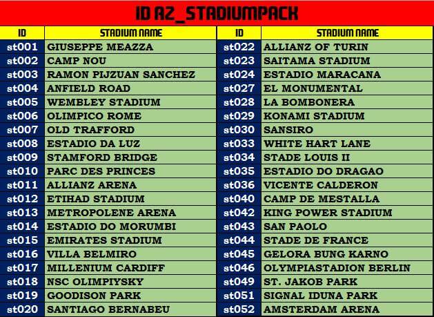 شما میتوانید لیست و آی دی تمامی استادیوم های موجود در این پک را از انتهای پست در داخل عکس که گذاشته شده است مشاهده نمایید.