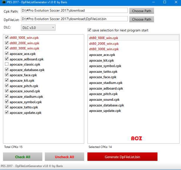 5- نرم افزار dpfilelist generator را دانلود کرده و طبق عکس زیر فایل های پچ را به ترتیب فعال کنید و در اخر generate نمایید.
