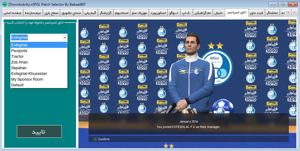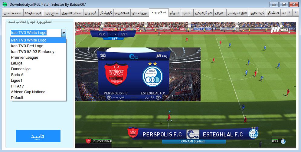 بارز ترین ویژگی PGL V4.0 را میتوانیم به سلکتور فوق العاده حرفه ای و کاملا فارسی اشاره کنیم که شامل 20 آپشن برای اولین بار میباشد ! شما با داشتن این سلکتور میتوانید بازی خود را کاملا شخصی سازی کنید و از اپشن های ان میتوانیم به قابلیت های تغییر اسکوربورد، ریپلی لوگو، لوگو پک،، استادیوم، گزارشگر فارسی، پرچم کرنر، اتاق اسپانسر ، فونت، کیت داور، سطح بازی، و …. اشاره کنیم