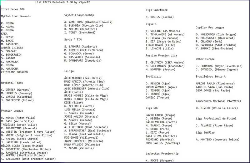 در دانلود دیتاپک 7 بازی PES 2021 شاهد اضافه و آپدیت شدن تعدادی فیس مختلف از بازیکنان قاره های مختلف بخصوص اروپا خواهیم بود که لیست آنها در زیر اورده شده است و هم چنین در این دیتاپک بعضی از تیم ها و لباس واقعی تیم ها هم بروزرسانی میشوند.